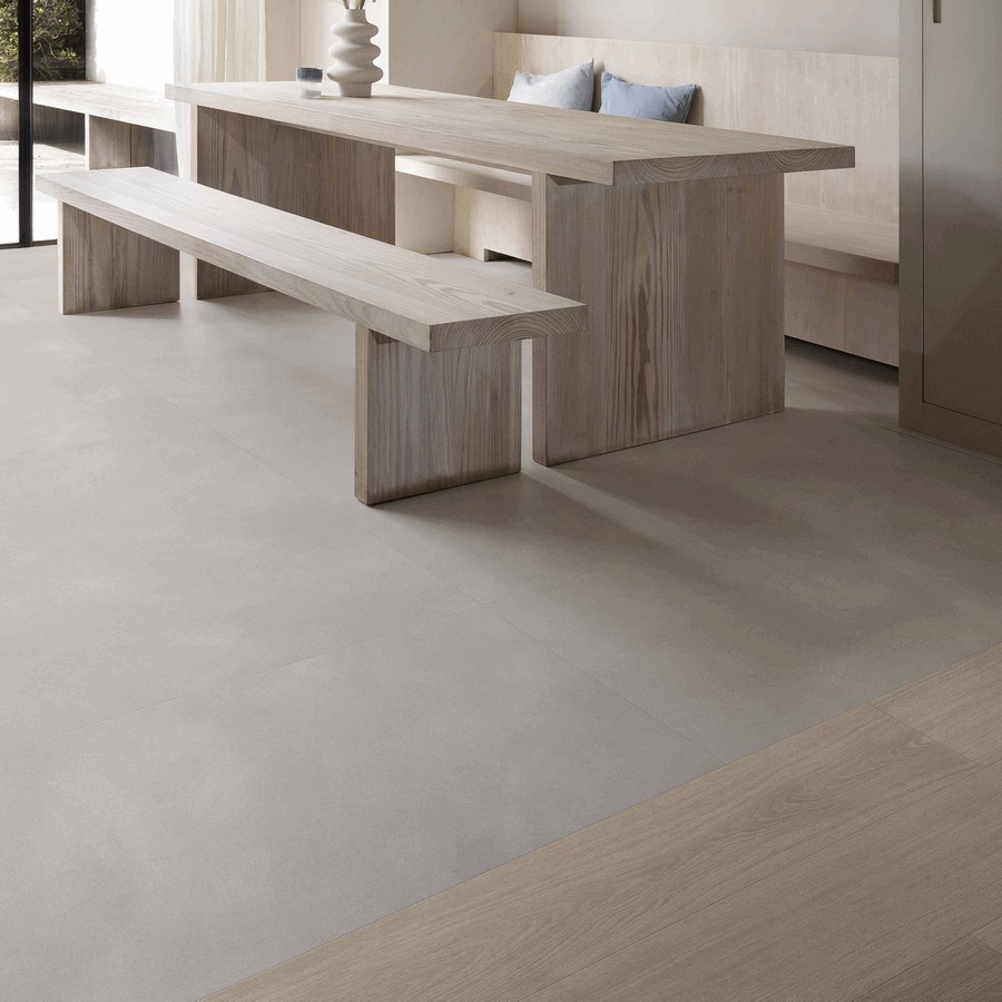 Элегантный, но в то же время создающий теплую атмосферу дизайн. Этот пол с мягкой патиной идеально сочетает эффект залитого бетона и волн ручной работы.